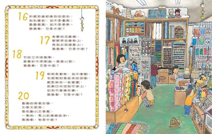 猜猜看、找找看,樂趣無窮的猜謎繪本!10 間好玩商店,帶你邊逛街邊猜謎,50 則趣味謎題,答案就藏在圖畫裡。