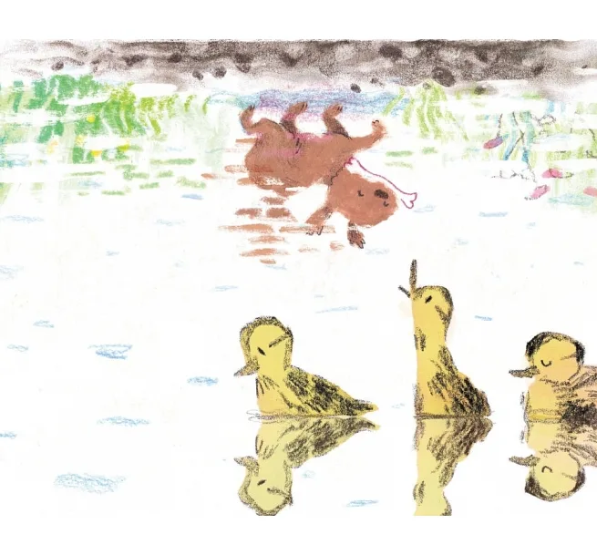 《更棒的骨頭》不僅在故事設定上極具巧思之外,在閱讀體驗上也下足了功夫。與一般童書橫向翻閱的方式不同,本書配合故事的「水中倒影」設定,採製直式製作,將賽門在池畔看著自己倒影的體驗完整的搬到繪本上,帶給讀者們身歷其境的沉浸式體驗。