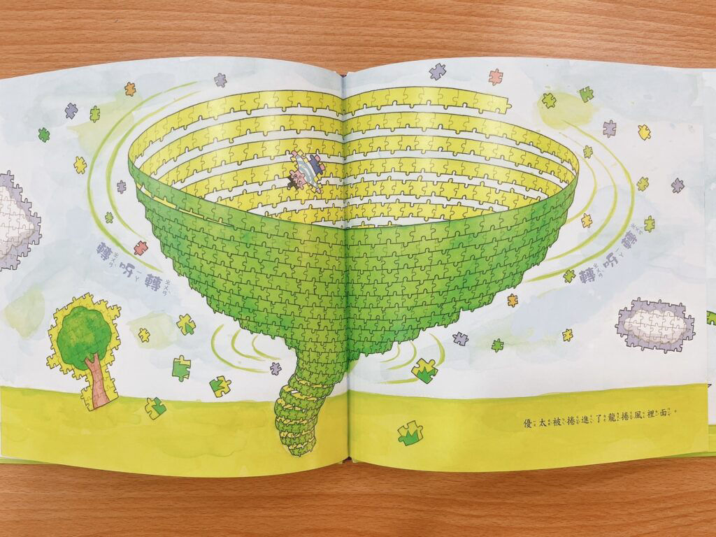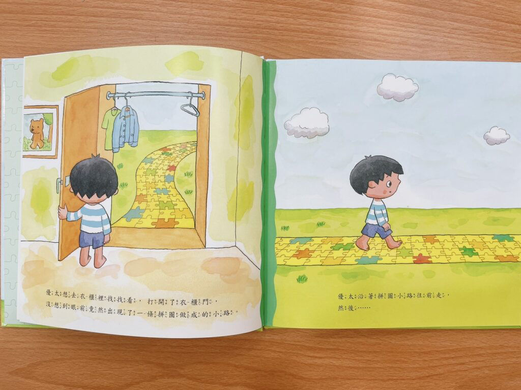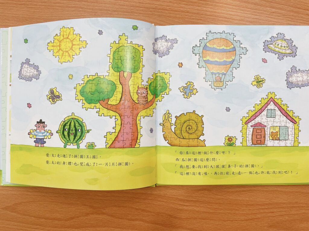 跳脫以往只能從平面的方式玩拼圖,這次繪本利用圖畫及文字,跟著小男孩前往夢幻的拼圖世界,比起以往2D的視野,透過立體感的呈現,也能有身歷其境的感受,尤其當書中的主角也變成一片片拼圖,還能與其他塊拼圖展開不同的對話和互動,更能勾起讀者的好奇心,想一探究竟那最後一塊的拼圖會藏在哪裡,又會在過程中發生什麼有趣的故事,在許多環節裡,也能激發讀者的想像力,畢竟只要拼圖的一角成功拼起,無論是頭上載著一隻大象和踩在公車頂,任何有趣的事情都能夠發生,說不定在閱讀的過程中,也能動動腦看哪邊也能拼起有趣的故事!