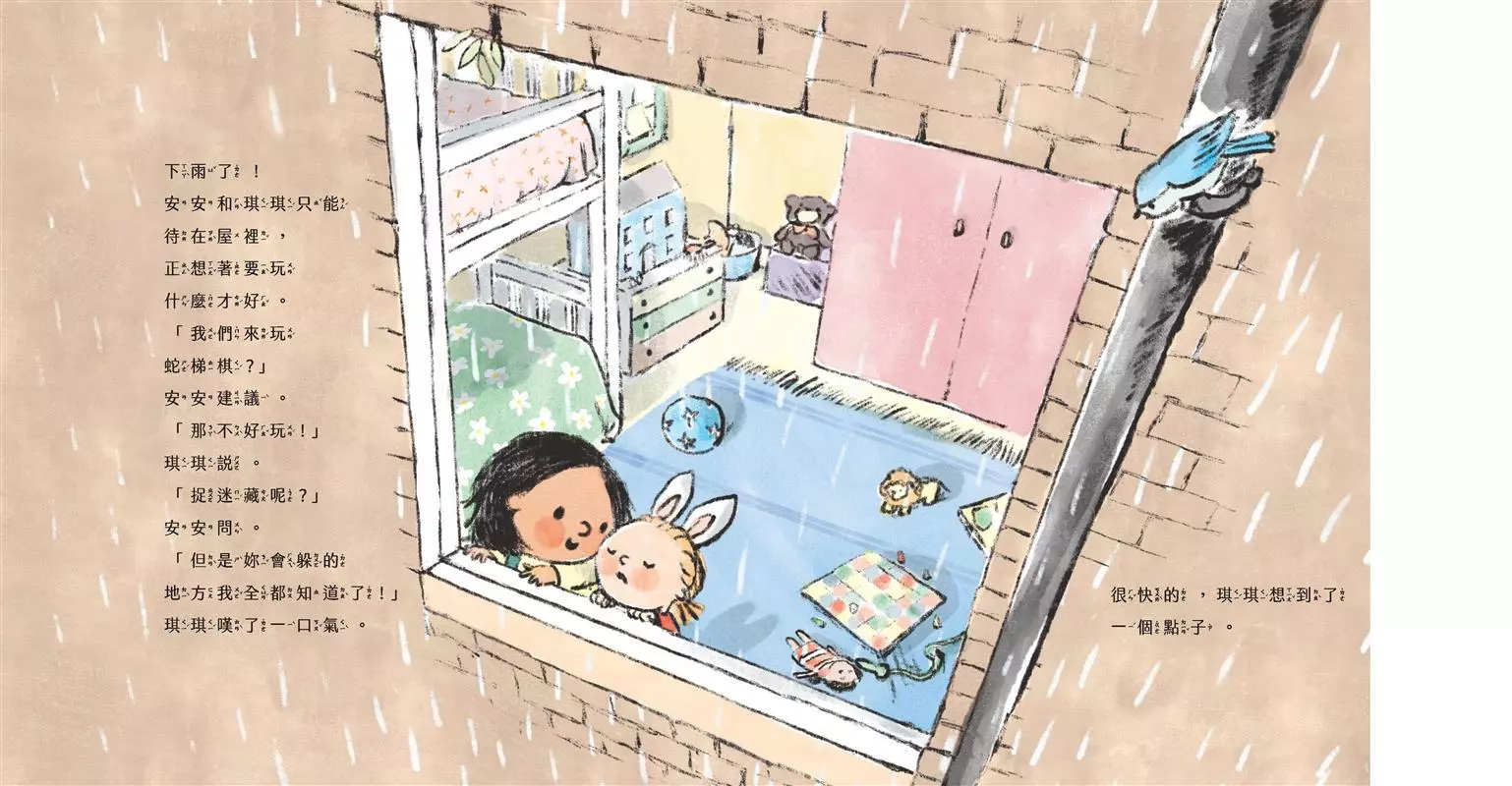 在書中,姊姊運用想像力,讓無趣的下雨天也開始有了新的契機,此外,當兩姐妹遇到困難時,想像力也再度派上用場,除了突破以往童書多只讓孩子體驗到想像力可以讓生活更多樂趣的功能外,書中故事也點醒孩子在未知、害怕的途中,想像力能夠成為挑戰中的解方,只要能善加利用,便能為生活中添加更多意想不到的驚喜。