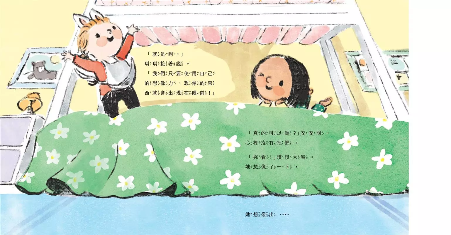 書中以手足之間的有趣互動為主題,講述著兩姐妹藉著空閒時間,運用想像力,展開一連串有趣的冒險,途中儘管遇到突如其來的挑戰,但仍可以運用自身力量,尋找不一樣的替代方案解決問題。此書不僅能讓孩子沈浸在充滿想像的空間,更能學習如何為自己的行為負起責任,解決問題,讓想像力不再只被當作激發創意的來由,更能成為處理未知事物的勇氣。