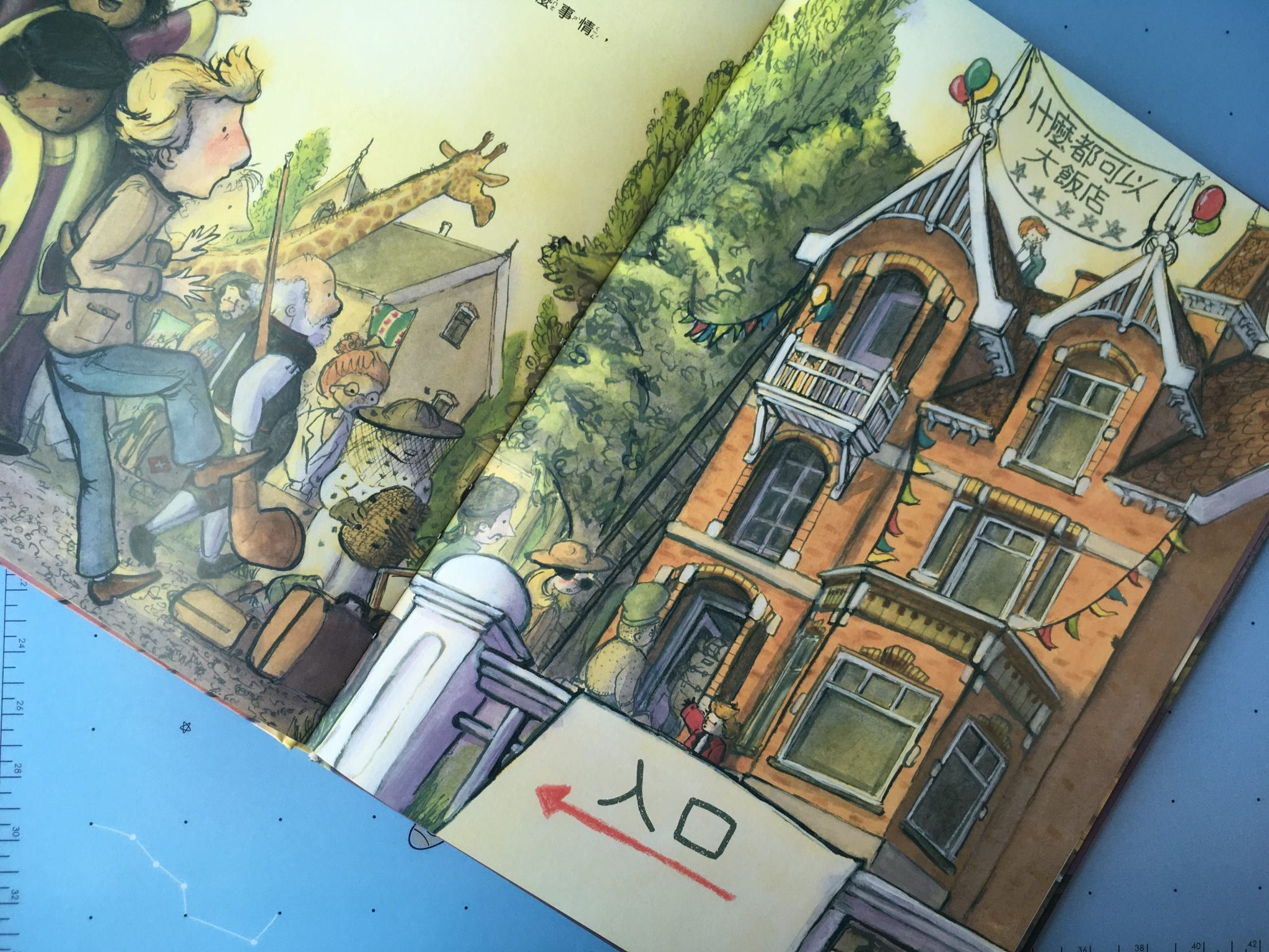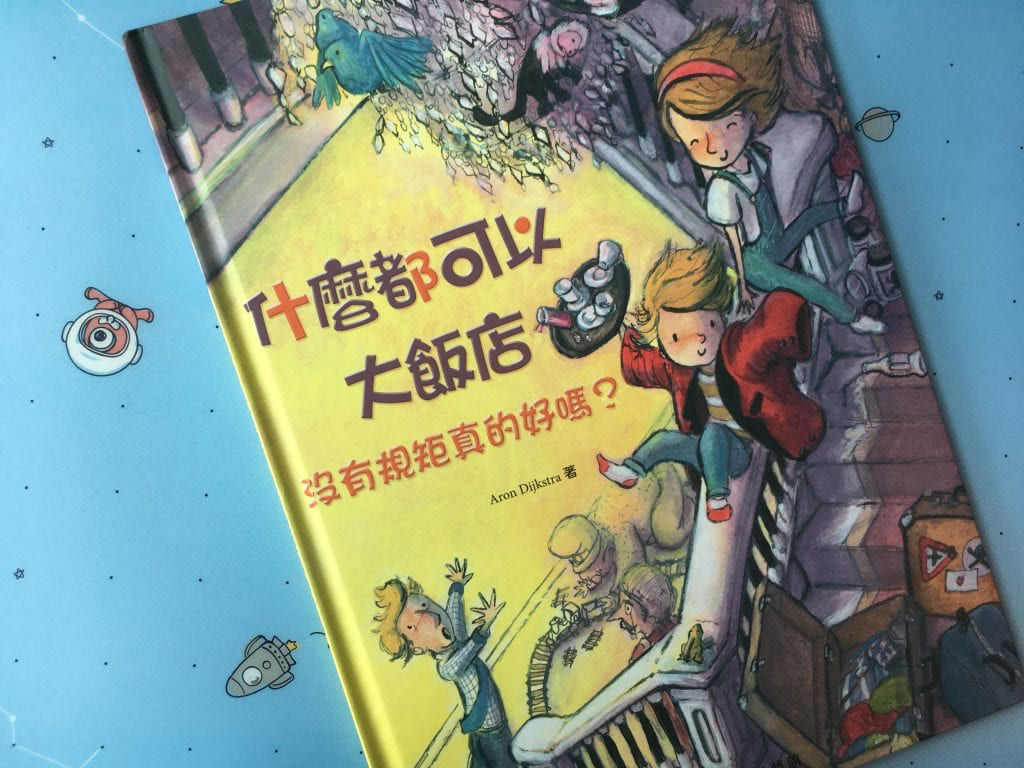 不過他們想到一個點子,那就是把家裡變成飯店,這樣一來,就可以大聲喧鬧、開心追逐了,於是艾瑪和堤摩西趁著爸爸不在家時,在屋頂掛起了「什麼都可以大飯店」的營業布條,就擅自開張營業了!