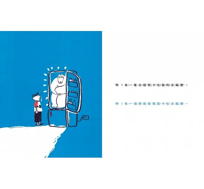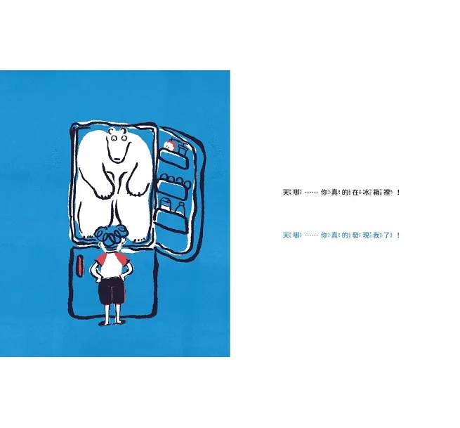 書中最讓人意想不到的一幕,莫過於當男孩發現藏有自己喜愛冰箱竟然藏了一隻北極熊,甚至還有神秘客,一個再日常不過的家電,經過作者的巧妙安排,開啟讀者的想像,讓冰箱宛若像百寶箱,刺激讀者思考還有什麼意外的驚喜可以藏在裡面,或許讀者也能迸出有不一樣的驚喜。