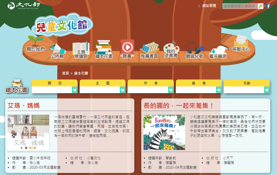 文化部創設的兒童文化館有悠久的歷史,以提升兒童閱讀興趣為目標,是一個專屬兒童線上閱讀的園地,藏有多樣豐富的繪本及動畫資源,不僅能夠線上看繪本、聽故事,還有許多互動小遊戲,讓孩童能以輕鬆、活潑的方式來享受閱讀,進而培養閱讀習慣。