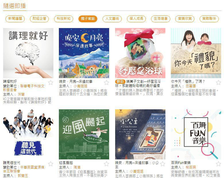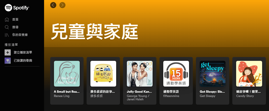 若是有下載名為Spotify的應用程式的家長,也可以到搜尋中選擇「Podcasts」裡的「兒童與家庭類別」,或是直接搜尋「繪本」等關鍵字,都能找到一些不錯的故事頻道喔,既方便又免費,不失為一個優質的線上聽故事資源。