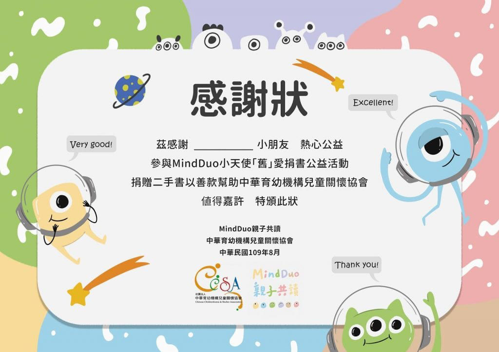 我們希望透過這樣一個簡單卻又暖心的公益活動,幫助需要溫暖的失家兒少,同時亦教導孩子們施比受更有福的觀念。你捐一本,MindDuo將會加碼捐贈二手童書予「書寶 X 中華育幼機構關懷協會」和「忠義基金會」,並頒發獎狀給予捐贈二手童書的孩子,鼓勵其熱心公益的精神!