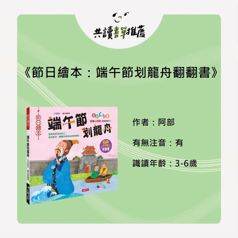 《端午節划龍舟》節合有聲書與翻翻書,透過聲音更生動地還原屈原的故事,翻翻書利用背後的驚喜,增加孩子閱讀時的趣味性。故事的結尾也說明端午節習俗的由來,包含包粽子、划龍舟、立蛋等。另外也有隨書附贈DIY摺紙遊戲,讓孩子親手摺出端午節粽子、龍舟,享受更多樂趣!