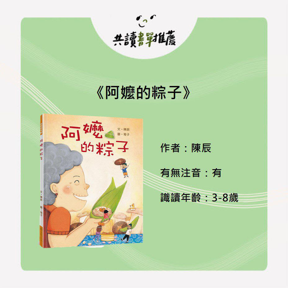 《阿嬤的粽子》用簡單的文字,描述一家人想念阿嬤的粽子,於是決定大家一起包粽子,嘗試找回熟悉的味道。本書描繪的端午節生活相當貼近日常,讓人有親切感也感到共鳴。在介紹端午節習俗的同時,也富有生命教育意義,用簡單的故事,讓孩子能有更深層的思考空間。