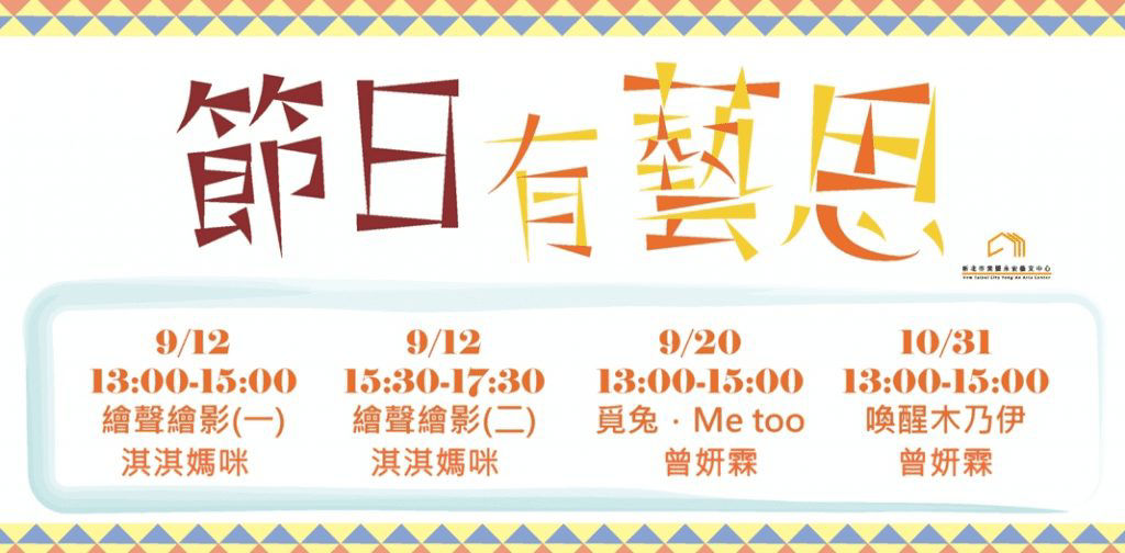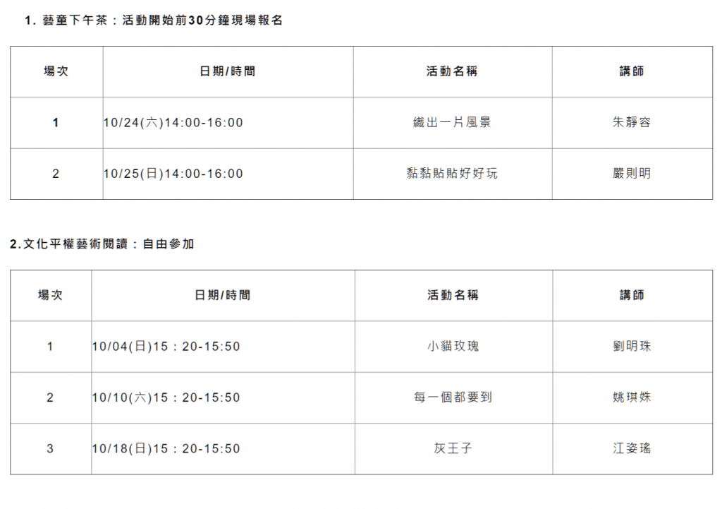 ■簡介: 週六親子樂時光,適合6歲以下小朋友(需要一位大人陪同),讓親子時光加上藝術的色彩,一起體驗藝術的神奇魅力。週三童趣小學堂,適合7歲-12歲,每梯次限額20名,將開設顏色遊戲、音樂之旅、古早味童玩學堂,透過藝術開拓小朋友感官體驗。