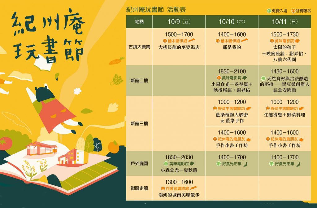 ■簡介:紀州庵「玩書節」以閱讀、食農、生態為主軸,邀請社區食農教育經驗豐富的「好食機」食農整合平台,共同打造適合大小朋友系列活動,一起來紀州庵歡樂度國慶假期吧!其中活動包含:作家領讀路線 —<鴻鴻的城南美味散步>、繪本喔伊細、野菜生態體驗坊、手作小書工作坊、美味電影院等好玩有趣活動。