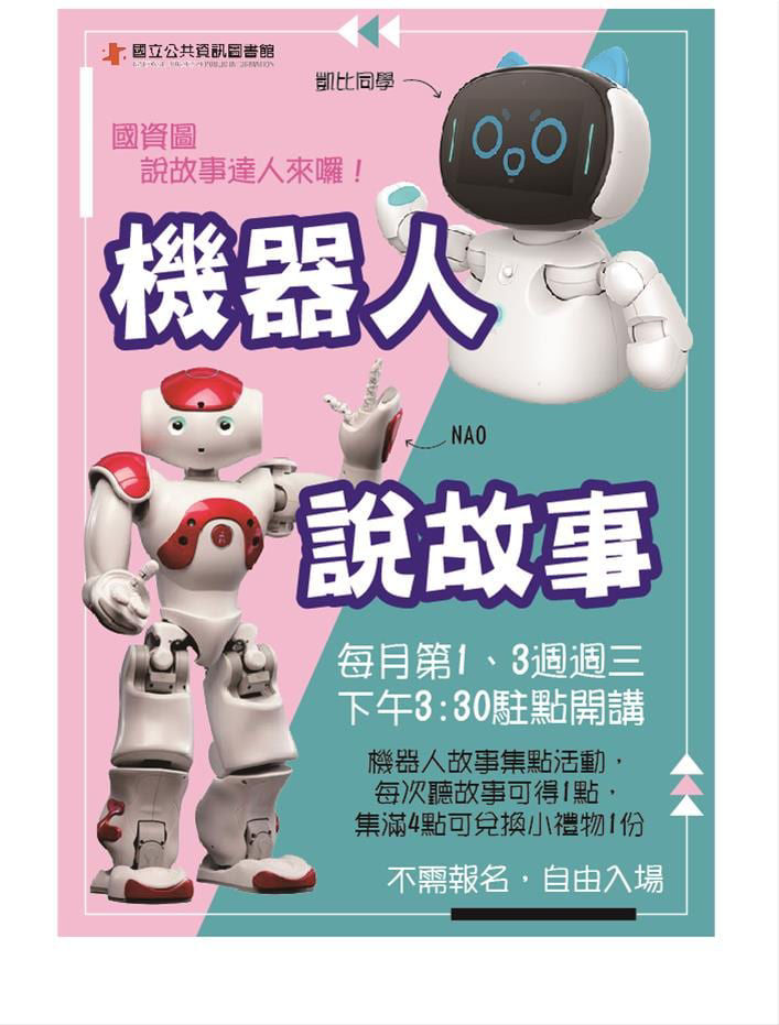 ■簡介:國資圖說故事達人來囉~想念會說話會跳舞的機器人NAO及凱比同學嗎?小朋友的聲音,我們都聽到囉!機器人固定駐館說故事,歡迎大小朋友一起來