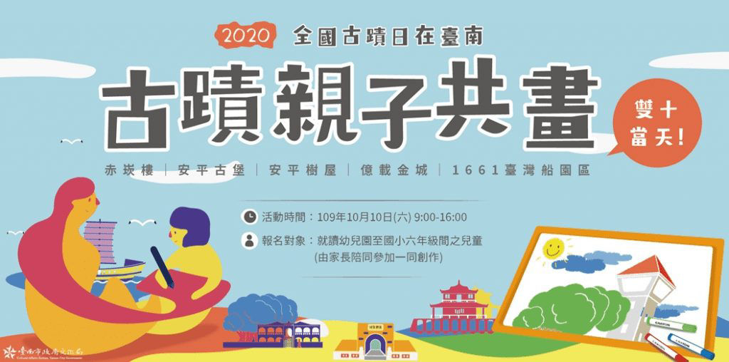 ■簡介:臺南是臺灣的歷史名城,擁有豐富的文化資產,包括各級古蹟與歷史建築。延續本(109)年全國古蹟日之主題「遺產教育行動 翻轉與創新」,希望運用趣味方式及日常入手,拉近文化資產與民眾的距離,爰規劃於雙十節慶,舉辦親子共同繪畫活動,鼓勵家長帶著學童實地走訪臺南古蹟景點,除增加民眾貼近文化資產之機會,也提供愛好繪畫學童揮灑及交流的舞臺,並在親子一同發揮靈感共同創作,展現各古蹟景點的歷史文化特色。參加者請於活動當日至報名時所選定之古蹟景點報到,中午午餐請參加者自理。參加者於16:00前完成作品後,請至活動報到處領取完畫獎品及榮譽獎狀