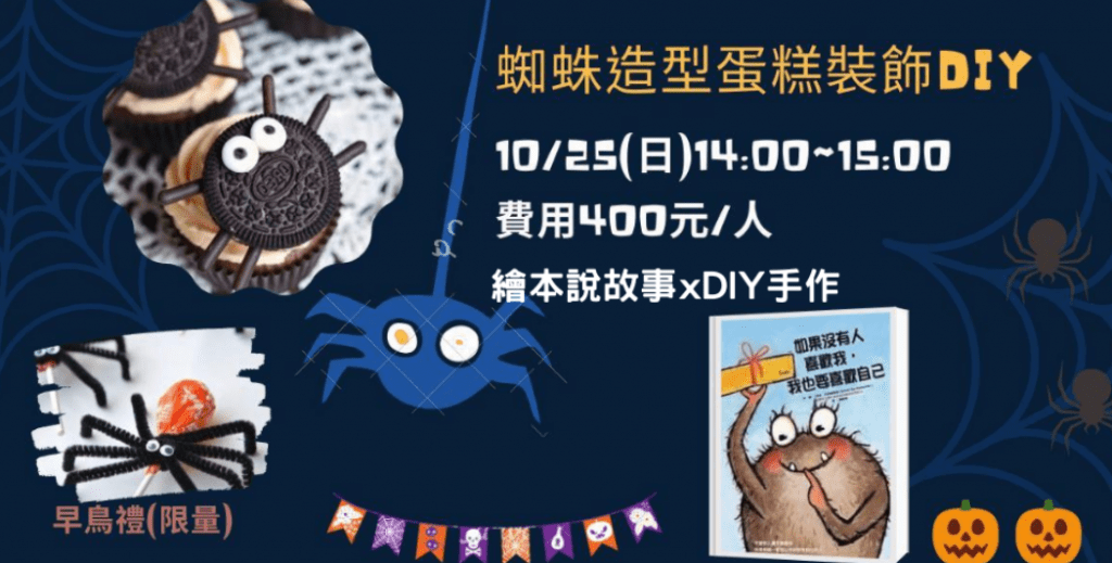 ■簡介:透過繪本導讀和孩子討論如何面對被討厭的情緒,接著親子一起裝飾萬聖節限定的蜘蛛造型蛋糕。為何大家一看到小蜘蛛,都要批評它、躲開它,跑得遠遠的呢?透過繪本導讀和孩子討論如何面對被討厭的情緒。為響應環保,請自備保鮮盒裝盛食物喔!