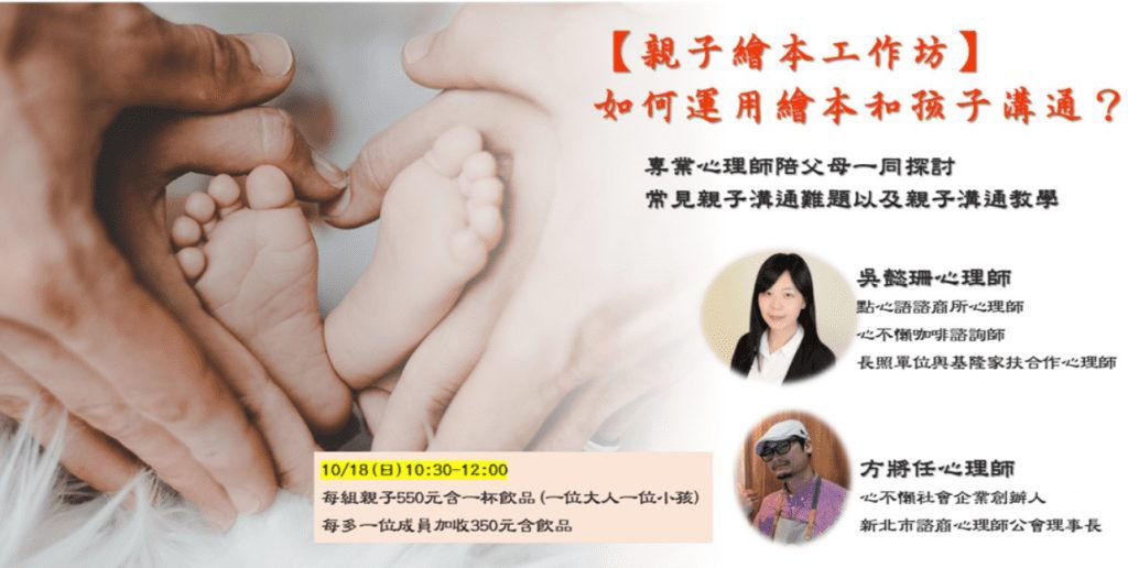 ■簡介:繪本講師繪本互動示範如何促進親子關係與溝通;專業心理師陪父母一同探討常見親子溝通難題,以及親子溝通教學。心不懶咖啡館的收入扣除成本後,將以固定比例轉作『喘息公益金』,並提供弱勢族群及照顧者友善關懷、喘息與諮詢等。