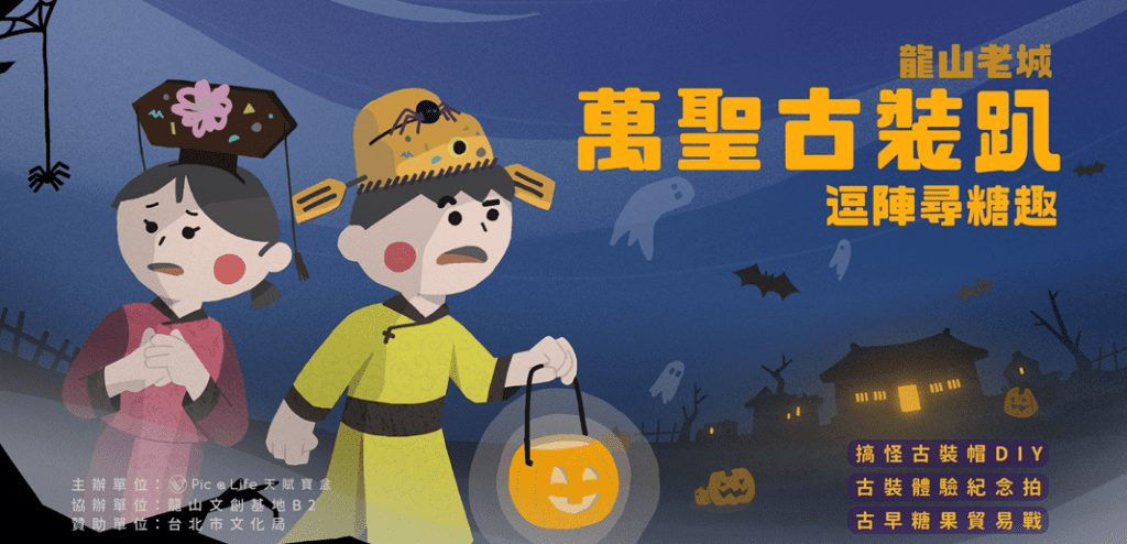 ■簡介:「結合古裝DIYx萬聖扮裝x古早味糖,鑑古知今還能用糖果換禮物回家!」孩子的討糖聲驚動了老城塵封已久的鐘擺,隨著時光逐漸倒轉1、10、 100年,巧克力變成橡皮糖,、公主裝變成格格服,原來,一場穿越時空的萬聖古裝趴即將開始。快跟著孩子前往龍山老城,一起打造古裝Look、穿越時空討糖趣吧!活動內容(全場由領隊帶領親子一起行動)包含:聽萬聖老城故事時間、古裝帽DIY-花漾格格帽/搞怪狀元帽 (擇一)、到特色店家解謎換古早味糖可兌獎品或優惠、穿上特色古裝拍紀念照。
