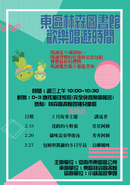 - 地點:新北市立圖書館土城分館柑林埤閱覽室3F兒童室