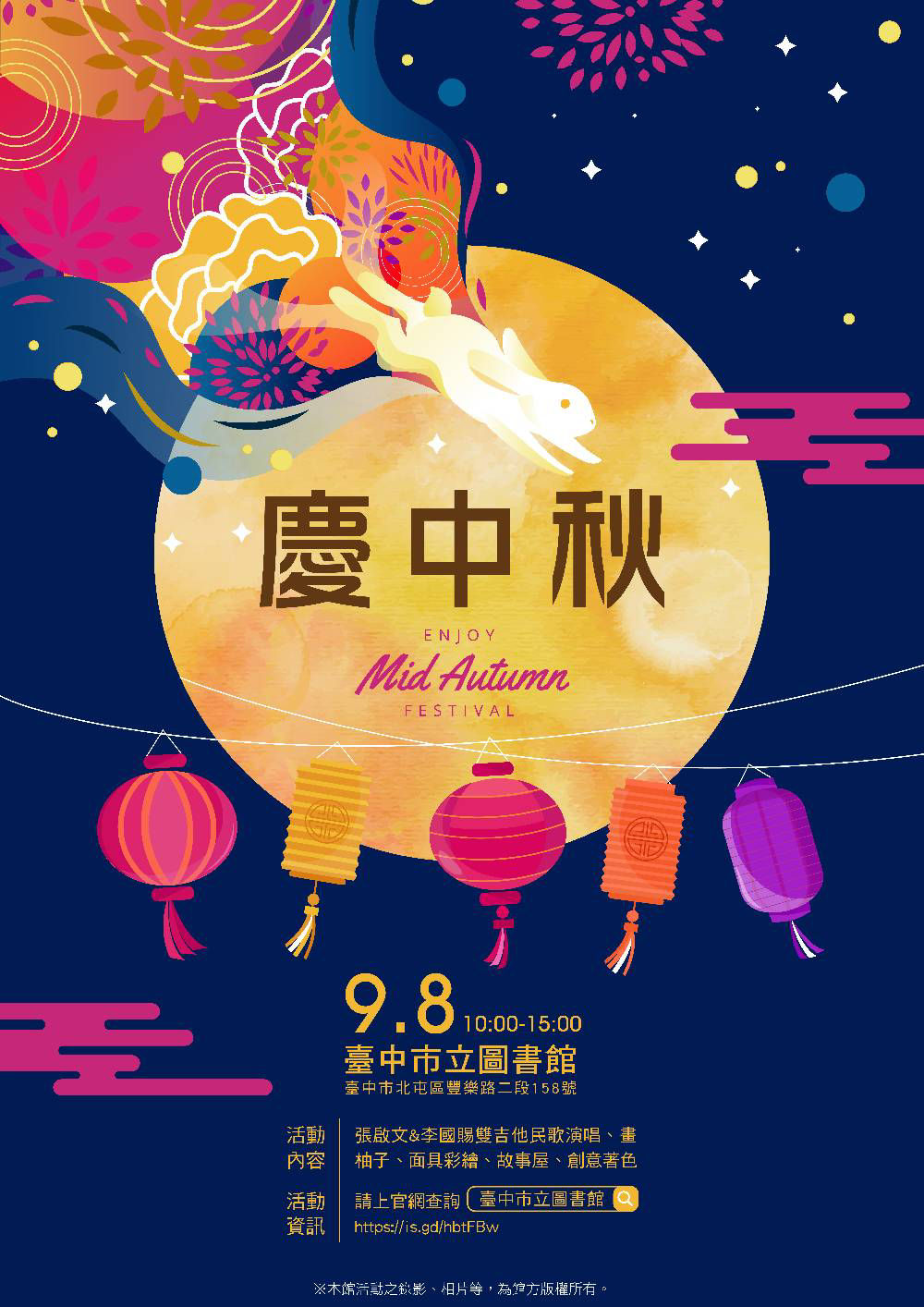 中秋節一直都是最受大家喜愛的節日之一,每到中秋節前夕,周遭總是充滿濃濃的中秋味,這個時候,家裡的餐桌上就會出現月餅和柚子,就知道中秋節快到了,小朋友也會開始吵著要烤肉賞月,就連大人們也期待這個節日的到來,在這個節日安排活動,慶祝一番!中市圖也不例外,安排了許多好玩有趣的活動要跟大家一起慶中秋!