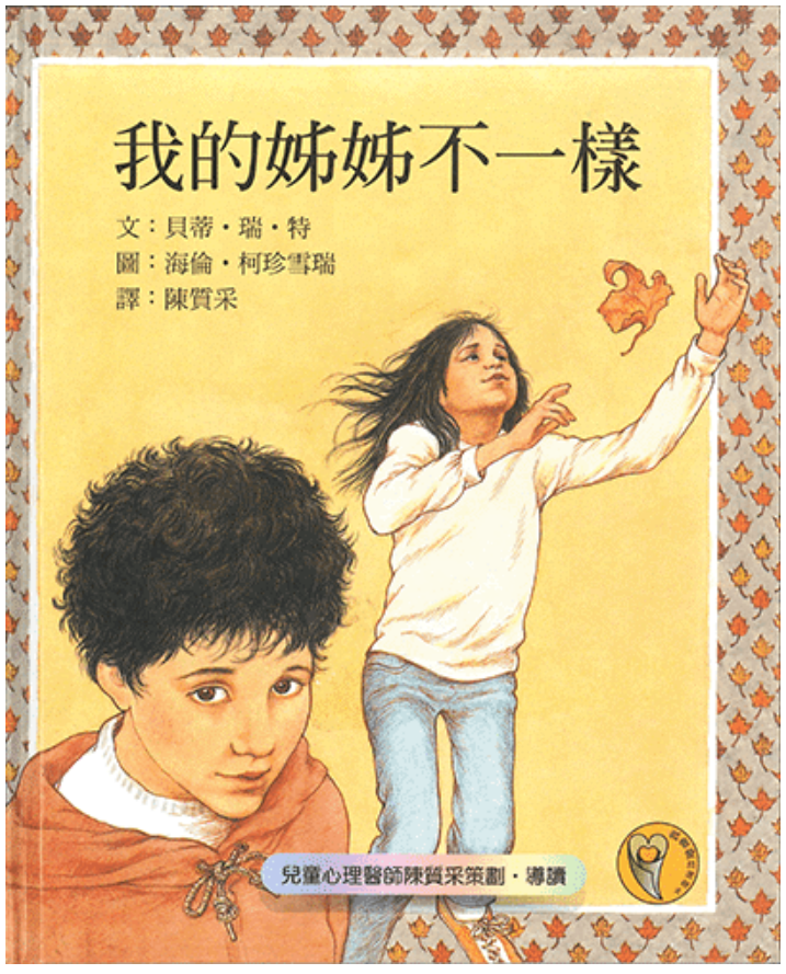我的姊姊不一樣/貝蒂.瑞.特:姊姊年紀比我大,身高比我高,但是主角卻必須每天陪在姊姊身邊,並且帶姊姊出門玩。而帶著姊姊出門的結果,總是狀況百出,不是引來玩伴的嘲笑,就是路人的側目。繪本藉由主角面對智障兒親人的心路歷程,讓孩子學會尊重的真諦。