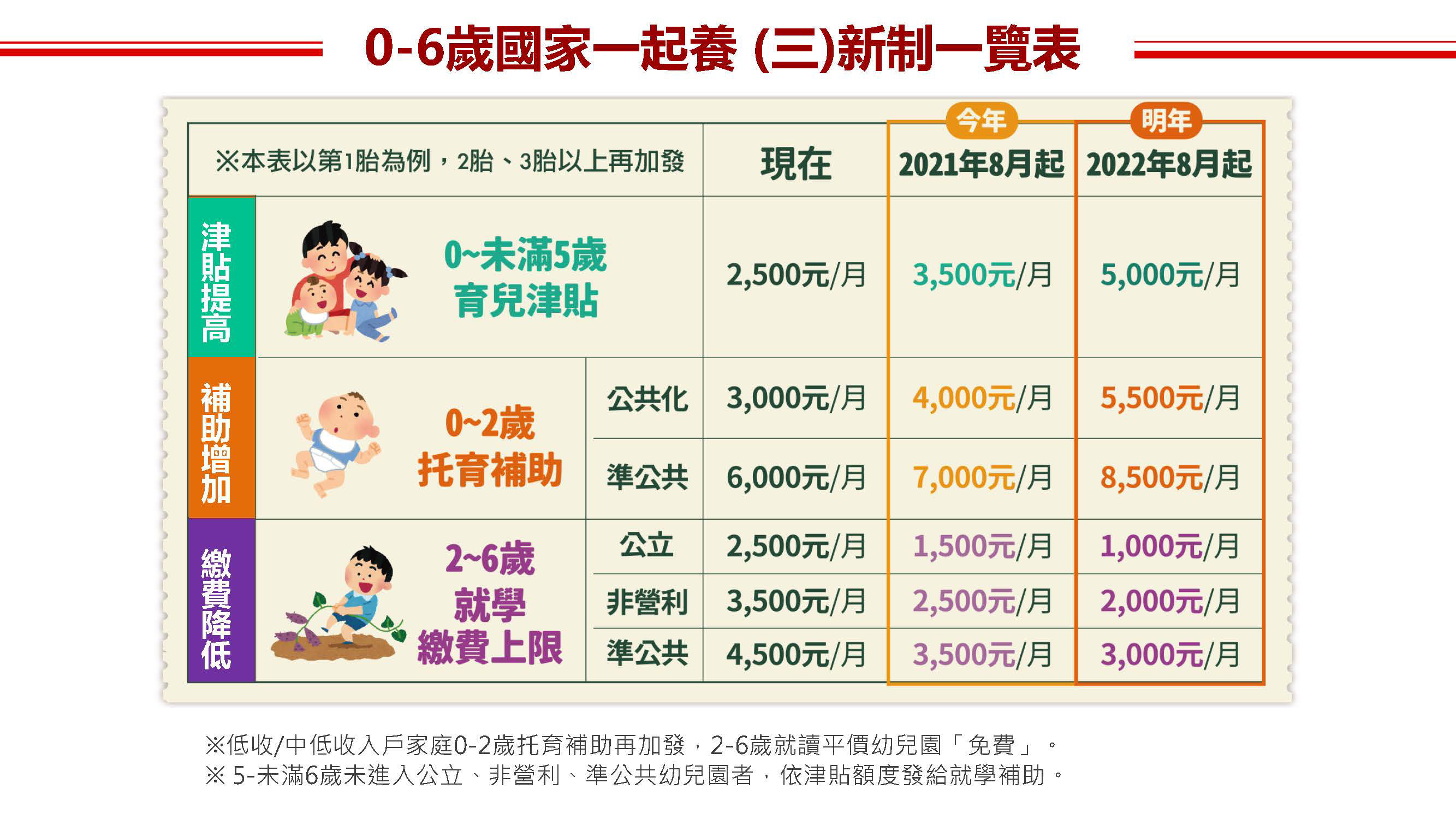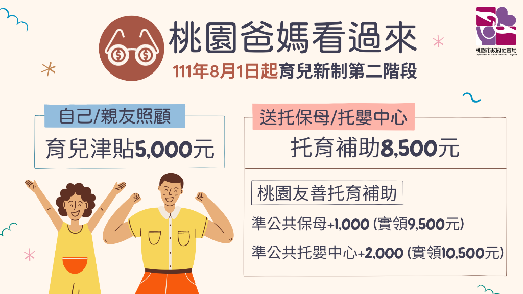 從2022年8月開始,公托機構的托育補助提高至5500元,準公共托育機構、保母則提高到8500元。另外對第二胎、第三胎以上、中低收入戶都有額外加碼。