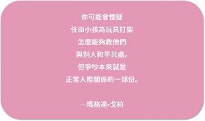 除了鼓勵小孩分開,強迫小孩分享玩具(通常等於你必須把那個玩具給其他小孩)或堅持他們輪流玩,都會讓小孩專注在玩具或物品上,而不是跟彼此建立關係。的確,大部分小孩都會經歷一段充滿佔有欲的時期,之後會消失,但如果我們冷靜地接受這段過程,它反而會很快過去。