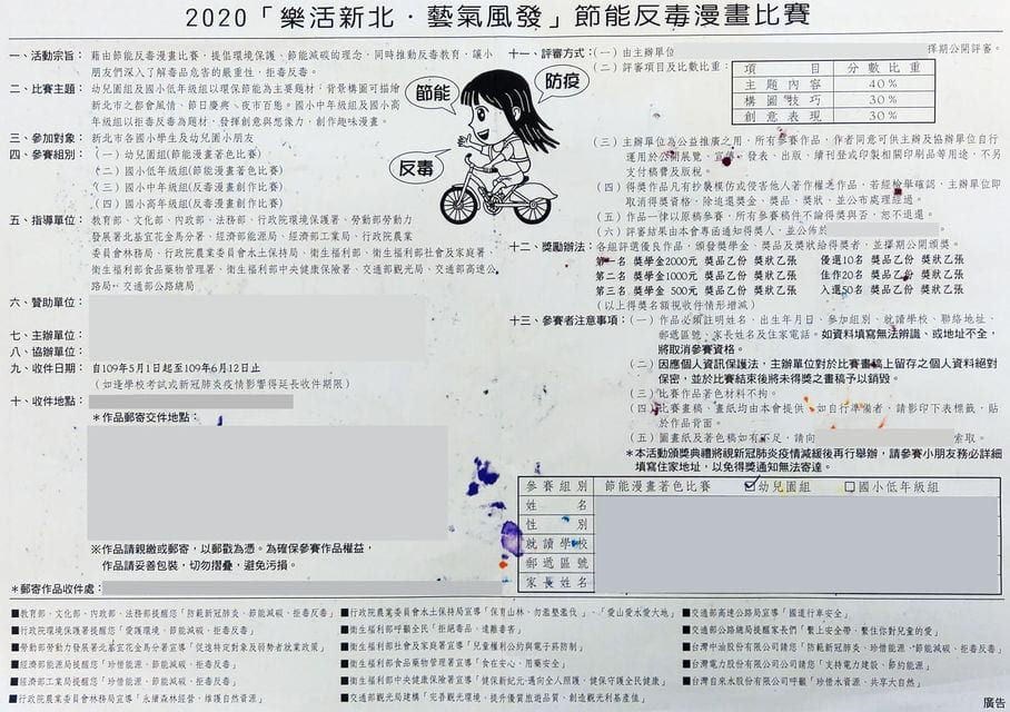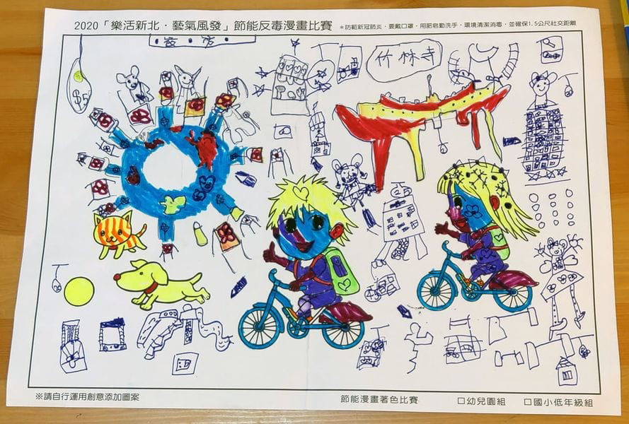 上學期,新北市的小朋友都要參加一個政令宣導繪畫比賽,幼兒園跟國小低年級是「節能漫畫著色比賽」:「以環保節能為主要題材,背景構圖可描繪新北市都會風情、節日慶典、夜市百態。」