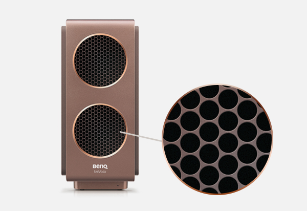 低音單體出音孔採用雙圓孔設計,出音表面積增加、氣流推動效率增加,並使用開孔率更高的細框圓孔金屬網罩,使聲音傳遞更直接。整體出音效率提升34.5%。