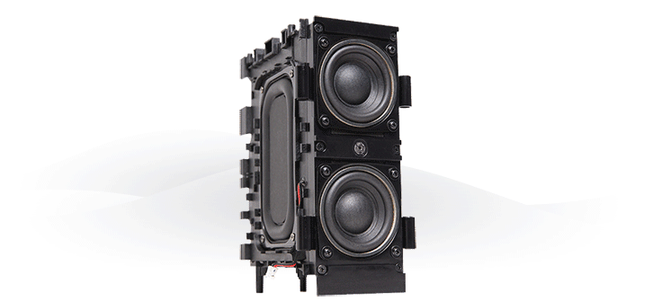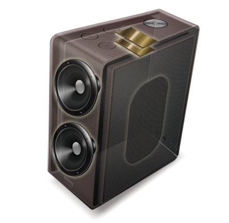 音響內部的低音系統採用雙喇叭+雙放大器的設計,搭配雙被動輻射器,讓渾厚低音精準地呈現,達成高中低音全方位的均衡與自然,讓你驚豔於如此乾淨、準確的聲音表現。