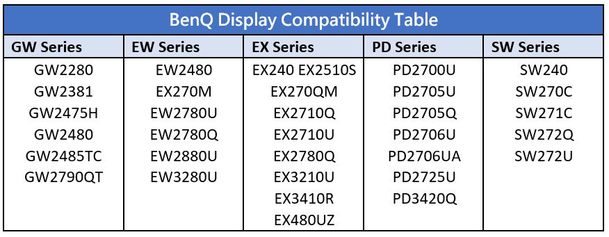 3. 如果您的 BenQ 顯示器未在表中列出,請聯絡當地 BenQ 客戶服務確認。