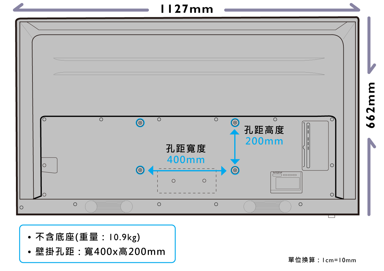 | 壁掛孔距(mm)(寬x高) | 400 x 200 mm | 300 x 200 mm | 400 x 200 mm | |